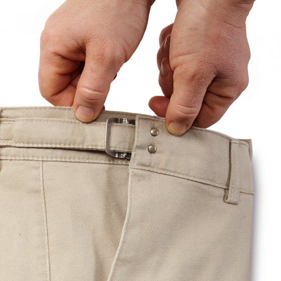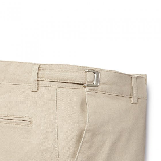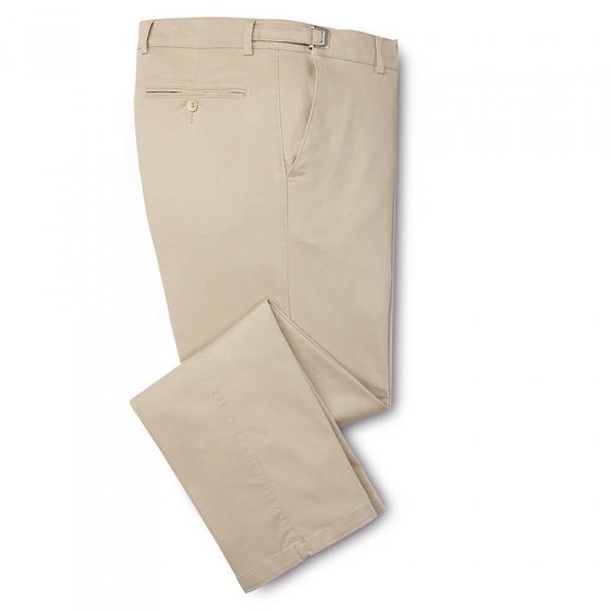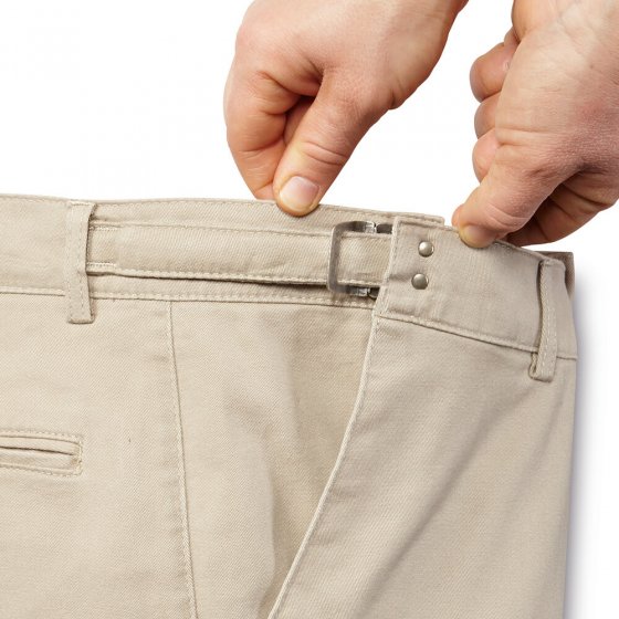 Deze stijlvolle KATOENEN COMFORTBROEK heeft iets heel bijzonders: door zeer discrete metalen clips opzij is de band naar wens aan te passen. Dat geeft de broek de perfecte pasvorm bij het lopen en staan, en meer bewegingsvrijheid bij het zitten: perfect voor het reizen en autorijden. De stof van 98% katoen en 2% Elastan beweegt comfortabel mee. Hij is bijzonder prettig in het dragen, is zacht en vormvast. Sportief en elegant model met 2 steekzakken en 2 achterzakken met knoop. De broek is voorzien van een ritssluiting en een haak- en knoopsluiting. En door de zomerse kleur is hij goed te combineren.