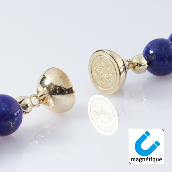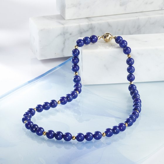 De mysterieuze lapis lazuli-edelsteen is al duizenden jaren een symbool van geluk en harmonie. Bij het creëren van deze betoverende KETTING MET LAPIS LAZULI EDELSTEEN kozen de ontwerpers voor een bijzondere combinatie: geslepen lapis lazuli bolletjes met fijne spikkels, die doen denken aan twinkelende sterren, afgewisseld met vergulde bolletjes van 925 zilver. Dankzij de praktische magnetische sluiting kan de ketting gemakkelijk worden omgedaan en bij elkaar worden gehouden. Afmetingen edelsteen (Ø): ca. 8 mm, lengte ketting ca. 45 cm. Ketting gemaakt van lapis lazuli en verguld 925 zilver. Geleverd met certificaat van echtheid. Een betoverend cadeau voor een vrouw die er graag stijlvol uit wil zien.
