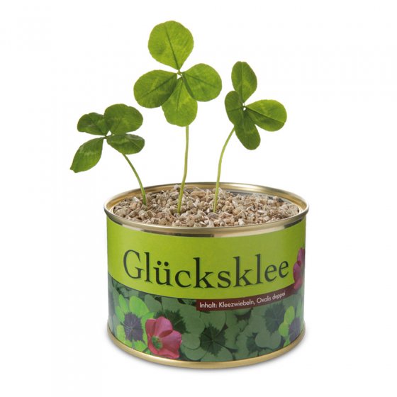 Vlak voor de komende jaarwisseling, zou u uzelf of een lieve persoon graag een beetje ‘geluk’ willen gunnen. Dan komt het klavertjevier uit blik precies op tijd! De legende van het klavertjevier is al meer dan 2.000 jaar oud. Vanwege zijn zeldzaamheid was het klavertjevier (lat. oxalis deppei) in vroegere tijden uitsluitend de Druïden voorbehouden. Deze wijze mannen waren ervan overtuigd, dat het bezit van deze zeldzame talisman beschermt tegen het al het kwaad. Tot vandaag de dag heeft het tere plantje niets aan symbolische kracht verloren – en juist daarom is de verassing perfect, als u zo’n klavertjevier cadeau doet. Elk blik (Ø ca. 10 cm) bevat 4-6 klavertjevier bollen. Gewoon de deksel eraf trekken, gieten – klaar! Binnen korte tijd groeit en bloeit het echte klavertjevier. Een gepatenteerd ‘schoon’ granulaat zorgt voor de ideale verzorging van de hoogwaardige zaadbollen. Later kan het meerderjarige klavertjevier in een grotere pot worden gepoot. Ook in de tuin of op het balkon kan het dan volop verder groeien en voor vele ‘gelukkige’ jaren zorgen!