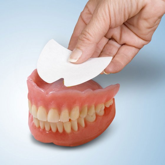 “Dieses Produkt (für Unter- und Oberkiefer) ist sehr praktisch. Nach gründlicher Reinigung der Prothesen und des Mundraumes werden diese Plättchen angefeuchtet und auf die Prothesen gelegt. Natürlich die Prothesen dann in den Mund gesteckt.