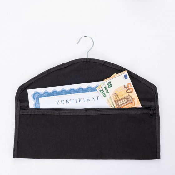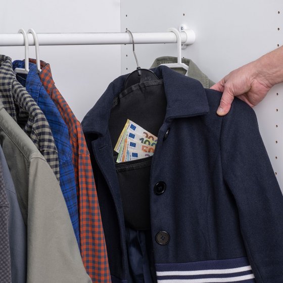 Ideaal voor onderweg: bescherm uw waardevolle spullen en papieren tegen onbevoegden in de praktische KLEERHANGER MET OPBERGRUIMTE. Hang uw jas, mantel of overhemd over de speciale kleerhanger en niemand zal vermoeden dat uw kostbaarheden eronder zitten. In het grote vak van de schuilplaats is voldoende plaats voor identiteitspapieren en DIN A4-documenten. Sleutels, geld of sieraden worden veilig opgeborgen in het kleine vakje binnenin. Afmetingen (b x h x d): ca. 45 x 31 x 1 cm. Gemaakt van slijtvaste oxford-stof. Of het nu in een vakantiewoning, in een hotel of in uw kledingkast thuis is: waardevolle en belangrijke voorwerpen zijn goed beschermd in deze schuilplaats!