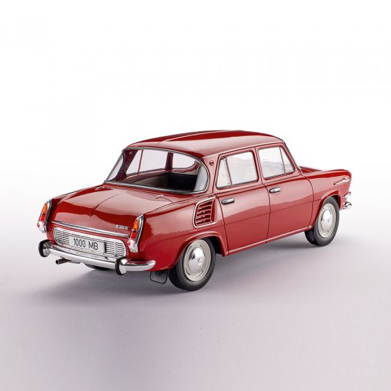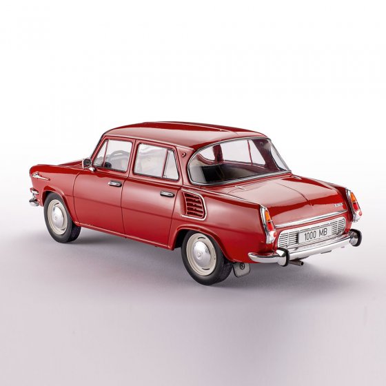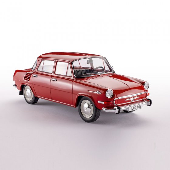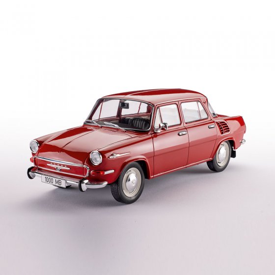 Met de 1000 MB demonstreerde de Tsjechische autofabrikant ŠKODA in het voorjaar van 1964 zijn technische expertise: het zeer vooruitstrevend ontworpen voertuig kreeg een moderne motor achterin met een aluminium behuizing die de achterwielen aandreef. Ondanks het lage vermogen van slechts 37 pk kon de auto, die slechts zo’n 750 kg woog, snelheden tot 120 km/u halen. Het schaalmodel (1:18) van de ŠKODA 1000 MB toont de Tsjechische auto trouw aan het origineel met een panoramische achterruit, chromen bumpers en de typische luchtinlaten op de achterspatborden. Afmetingen (l x b x h): ca. 23 x 9 x 8 cm. Iedereen die populaire klassiekers en klassieke auto’s waardeert, moet dit prachtige aandenken aan de 1000 MB zeker aan zijn collectie toevoegen!