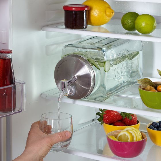 Goed drinken is, vooral in de zomer, heel belangrijk – aanbevolen wordt 1–2 liter per dag. Met deze KOELKAST-DRANKAUTOMAAT is frisdrank in no-time ingeschonken. Gewoon de koelkast openen, het glas onder het kraantje houden en comfortabel doseren. Het rechthoekige glasmodel past perfect in de koelkast en bespaart ruimte. Sappen, spritzers of ijsthee blijven langer vers en koud. Dankzij de grote opening met schroefsluiting gaat het bijvullen snel – ook vruchten voegt u naar wens toe. Afmetingen (l x b x h): ca. 32 x 12 x 14 cm. Inhoud: 3 liter. Materiaal: glas en edelstaal. Deze zomer komt u niets tekort.