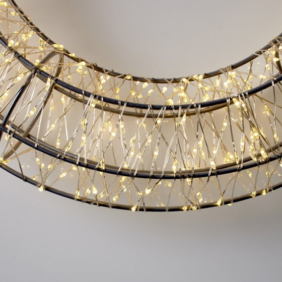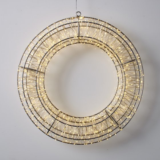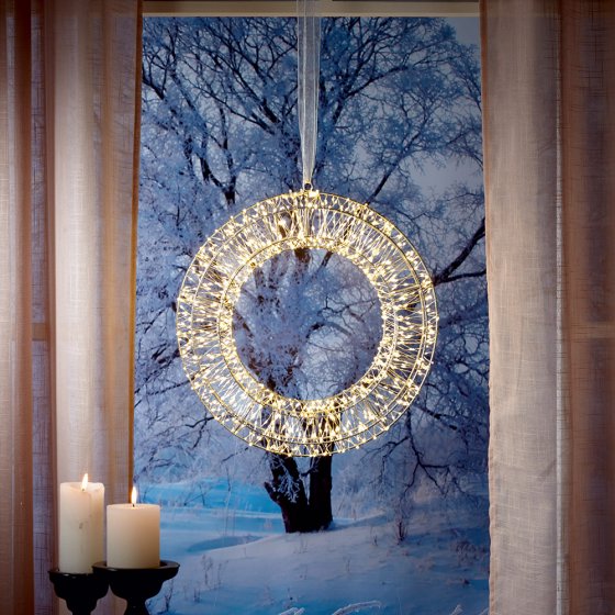 Voor het raam, aan de muur of als betoverende decoratie in de kamer: de imposante KRANS MET LEDVERLICHTING zorgt voor sfeervolle lichtaccenten in uw huis. Het stevige metalen frame is nauwkeurig omwikkeld met een hoogwaardige ketting met ledverlichting van transparant draad. In totaal 960 microleds met meer dan 30.000 branduren zorgen voor een onmiskenbaar lichtspel in de avonduren. Bijzonder handig: de dubbele timerfunctie schakelt de ledverlichting automatisch aan en uit. Werking via een 230V-stekker (voedingskabel: 5 m). Afmetingen (Ø x b): ca. 38 x 7 cm. Geniet van de feestelijke decoratie die zorgt voor sfeervol licht in het donkere seizoen!