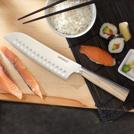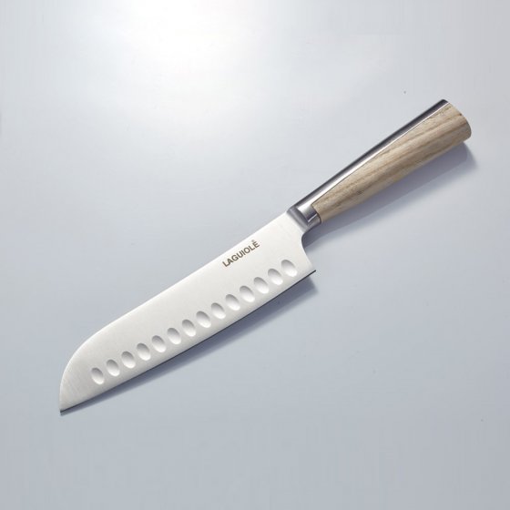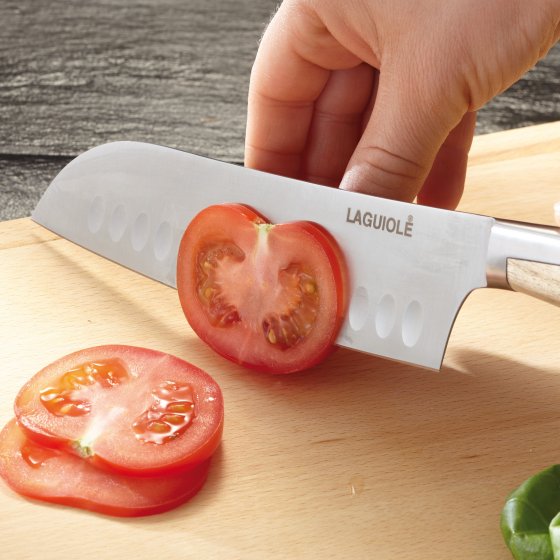 Normaal gesproken vindt men hoogwaardige Laguiole-messen in broekzakken, maar dit ultrascherpe LAGUIOLE-SANTOKUMES is uitgevoerd in keukenformaat! Het 17 cm lange lemmet met ingeslepen langwerpige diepe delen boven de snede is perfect voor de bereiding van vlees, vis en groente. Niets blijft aan het edelstalen lemmet kleven, hoe dunne plakken u ook snijdt! De opvallende doorn, die de greephelft van essenhout compleet vult, maakt het mes tot een echte blikvanger en balanceert deze optimaal uit. Afmetingen (l x b x h): ca. 30 x 2 x 5 cm. Gewicht: ca. 185 g. Ook heel leuk als cadeau, wanneer u bij vrienden bent uitgenodigd voor het eten.