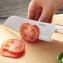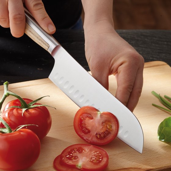 Het Japanse begrip Santoku is samengesteld uit de woorden 'San' = drie en 'Toku' = deugden, omdat dit mes ideaal is voor het snijden van vis, vlees en groente. Dit zijn de 3 belangrijkste ingrediënten in de Aziatische keuken. Met zijn karakteristieke greep, die vooral de vingers beschermt, is dit het perfecte multifunctionele mes.