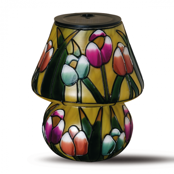 Deze schitterende LAMP IN TIFFANY-STIJL OP ZONNE-ENERGIE (genoemd naar de beroemde sierkunstenaar Louis C. Tiffany) geeft uw omgeving een gezellige, knusse atmosfeer. Het licht van de 2 heldere, witte LEDs wordt door het stijlvolle tulpenmotief op het glas zo weergegeven, dat een veelkleurig, warm licht ontstaat, waardoor elke ruimte betoverd wordt. Dank zij een sterke zonnecel heeft deze fascinerende lamp (hoogte ca. 20 cm, Ø ca. 15 cm) geen stroom, bedrading of batterijen nodig. Overdag wordt de zonne-energie opgeslagen en bij donkerheid gaan de LEDs door middel van de geïntegreerde schemeringssensor automatisch aan en stralen in zinnelijke en behaaglijke pracht.