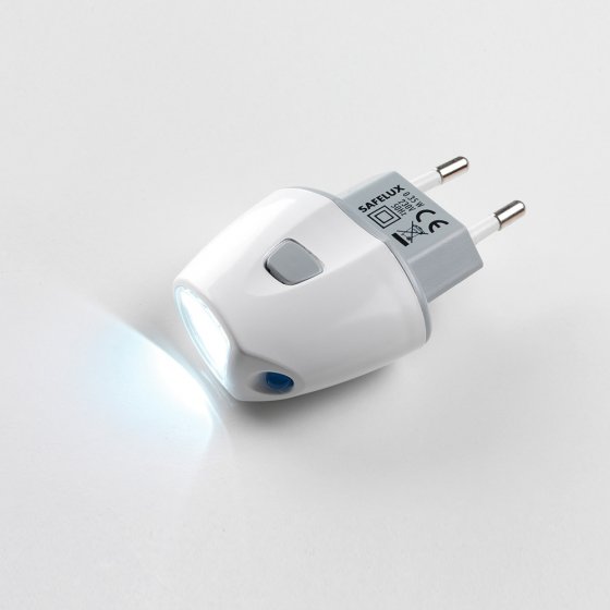 Faites-vous, vous aussi, partie de ces personnes qui n’aiment pas se retrouver dans le noir complet ou qui sont désorientées en cas de coupure de courant le soir ? Notre LAMPE DE SÉCURITÉ 3 EN 1vous évitera de vous retrouver complètement dans le noir chez vous : il vous suf t de la brancher sur une prise de courant et vous pourrez également l’utiliser comme lampe d’orientation à éclairage léger. En cas de coupure de courant, la source de lumière puissante de la lampe de sécurité s’allume automatiquement (alimentée par une batterie intégrée) et éclaire tout ce qui se trouve à proximité immédiate d’une lumière blanche. Comme cette lampe de sécurité s’allume et s’éteint en appuyant sur un bouton sur le côté, vous pouvez également l’utiliser comme lampe de poche : il vous suf t de l’enlever de la prise de courant.Cette lampe de sécurité peut rester constamment branchée sur une prise de courant ; la batterie n’en sera pas endommagée et votre facture d’électricité non plus. Dim. (L x l x h) : env. 7 x 2 x 5 cm. Gardez le cap, même en cas de coupure de courant… et même la nuit !