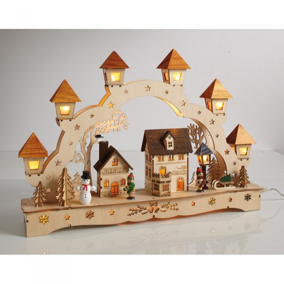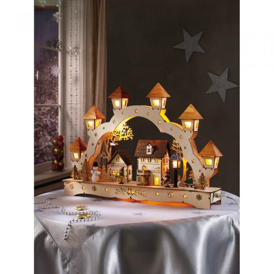 Hoog boven het kerstdorp stralen de lantaarns in warm licht: de LANTAARN-LICHTBOOG verbeeldt een winters landschap van bomen, dennen, huizen, een kerk, sneeuwpop en spelende kinderen met sleetjes – gefreesd in verfijnd hout en omrand door sfeerwol licht van 10 leds. Aantrekkelijk, ambachtelijk zaagwerk maakt dit item ook van achteren mooi om te zien en het pleziert elke voorbijganger. Werkt op het meegeleverde voedingsadapter of 3 AA-batterijen (afzonderlijk te bestellen). Afm. (l x b x h): ca. 42 x 8 x 29 cm. Een winterse blikvanger op uw vensterbank – er valt van alles te te ontdekken.