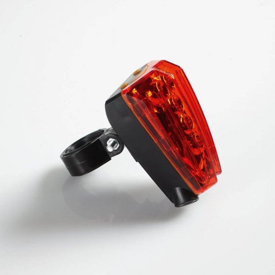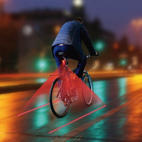 Op de weg zijn fietsers erg kwetsbaar, vooral in het donker. Het LED-ACHTERLICHT MET LICHTSPOOR zorgt voor meer veiligheid: het is niet alleen een extra achterlicht dat heel fel schijnt in 3 te selecteren lichtprogramma's (continulicht, knipperlicht, flash-licht), maar het projecteert ook twee lichtsporen links en rechts naast de fiets op de straat. Zo ontstaat een virtueel fietsspoor, dat automobilisten op afstand houdt. De lamp is door middel van een ronde klem aan de zadelstang te bevestigen en kan er dankzij het kliksysteem gemakkelijk aangezet en afgehaald worden. Werkt op 2 AAA-batterijen (afzonderlijk te bestellen). Afmetingen (l x b x h): ca. 5 x 8 x 5 cm. Met deze waardevolle aanvulling op de normale fietsverlichting gaat u altijd veilig op pad.