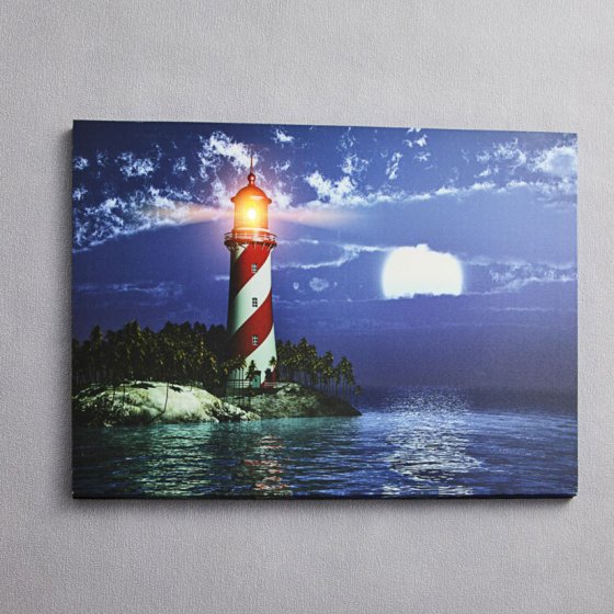 Geniet van de zee bij nacht. De LED-ARTPRINT 'VUURTOREN' ziet er niet alleen heel mooi uit, maar voorziet uw interieur ook van een sfeervol licht. De prachtige kust is een bijzondere blikvanger. Boven aan de vuurtoren bevindt zich een warmwitte led, die het kunstwerk op echt linnen van een continu brandend lichtje voorziet. Door de schakelaar aan de rand van de artprint in te drukken laat u het lichtje schijnen. Heel praktisch: werkt op 2 AA-batterijen (afzonderlijk te bestellen) – zo kunt u de artprint ook ophangen aan wanden waar geen stroomaansluiting in de buurt is. Afm. (bxhxd): ca. 60x40x2 cm. Een mooi uitzicht op uw 'thuishaven'.