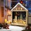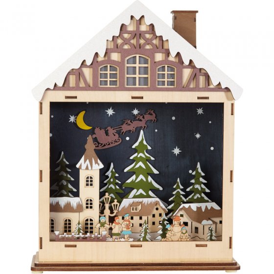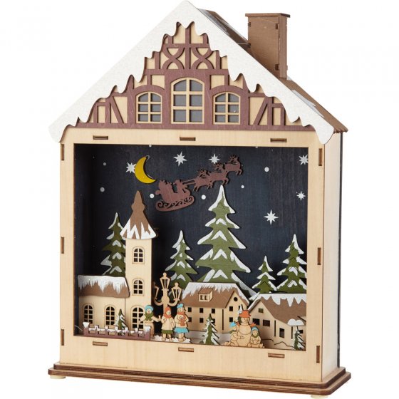 HET HOUTEN HUISJE MET LEDVERLICHTING "MARKTPLEIN" herbergt een compleet dorpstafereel! De vliegende slee getrokken door rendieren brengt u meteen in de kerststemming. Wedden dat nieuwsgierige kinderen veel vragen zullen stellen over dit leuke detail? De volledige scenerie wordt verlicht met 10 warmwitte leds, waarvan ook enkele het raam in de topgevel verlichten. Werkt op 2 AA-batterijen (apart verkrijgbaar) Omdat u geen stopcontact nodig hebt, kunt u het huisje overal waar u dat wilt plaatsen. Afmetingen (l x b x h): ca. 10 x 28 x 36 cm. Dit huisje is ook een fantastisch cadeau en niet enkel voor liefhebbers van kerstversiering!