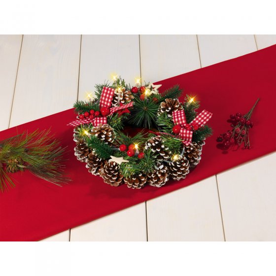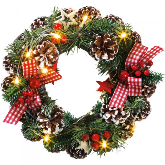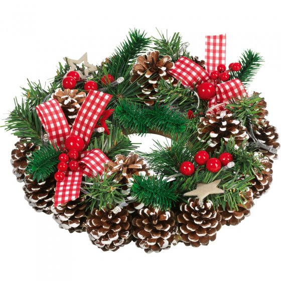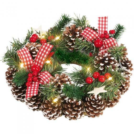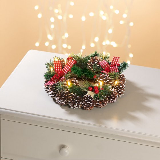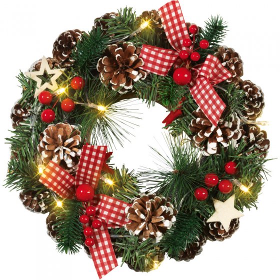 Deze LED-KERSTKRANS verspreidt een feestelijke sfeer in huis – waar u maar wilt. U hem ophangen of neerleggen: dankzij batterijvoeding bent u niet afhankelijk van stopcontacten. Liefdevol met echte dennenappels gedecoreerd. Zo zorgt de krans met geïntegreerd lichtsnoer van 10 warmwitte led's voor een gezellige sfeer – zonder enig brandgevaar! Afm. ca. Ø 30 cm / H 9 cm. Werkt op 2 AA-batterijen (afzonderlijk te bestellen). Takken van kunststof.