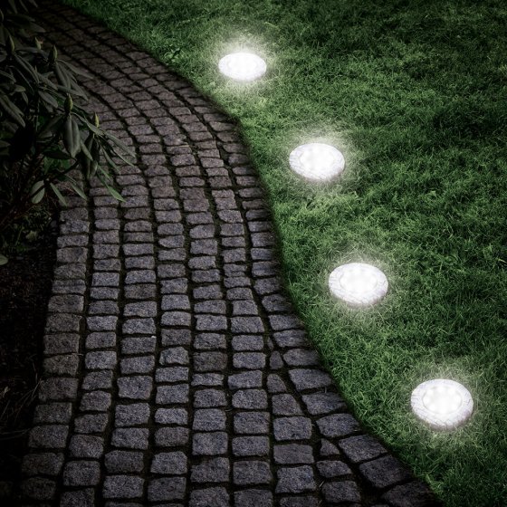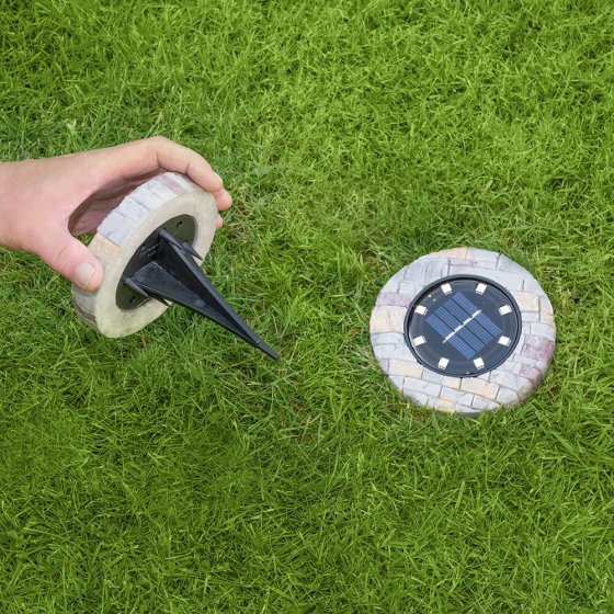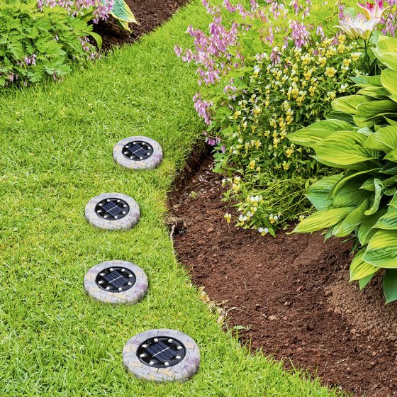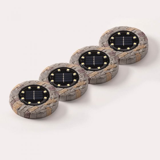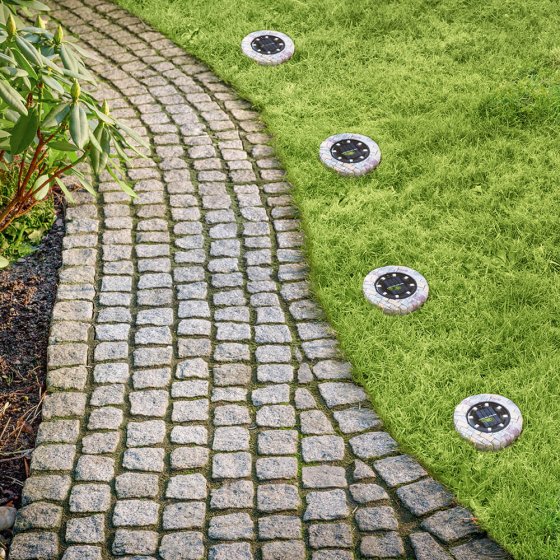 Zet uw tuin, planten en paden in het juiste licht en geef de ruimte om uw huis een bijzonder accent. Deze LED-GRONDLAMP IN STEEN-LOOK in een praktische set van 4 blinkt uit met vele nieuwe eigenschappen: in totaal 8 leds per lamp, een krachtige accu en de prachtige steen-look maken de extra grote, op zonne-energie werkende grondlampen perfect voor het accentueren van de ruimte om uw huis. De zuinige leds laden overdag op en gaan, dankzij de schemeringssensor, in het donker automatisch schijnen. Materiaal: polyresine, kunststof. Afmetingen incl. grondpen (H / Ø): ca. 13,5 / 11,5 cm. Voor het draadloos plaatsen van lichtaccenten.