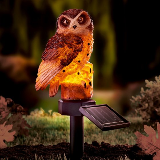 De LEDUIL OP ZONNE-ENERGIE zal u betoveren, zowel overdag als in het donker. Overdag maakt hij indruk met zijn authentieke kleuren en zijn echt lijkende ogen; in het donker, verlicht door een sterker type led, betovert hij met een mysterieuze gloed die een bijna mystieke sfeer creëert. Het zonnepaneel op de basis is beweegbaar en kan dus precies op de zon worden gericht. De verlichting is sensorgestuurd en begint bij schemering. Afmetingen (l x b x d, zonder grondspies): ca. 17 x 19 x 8 cm. Lengte grondspies: ca. 15 cm. Trakteer uzelf op een zeer speciale blikvanger.