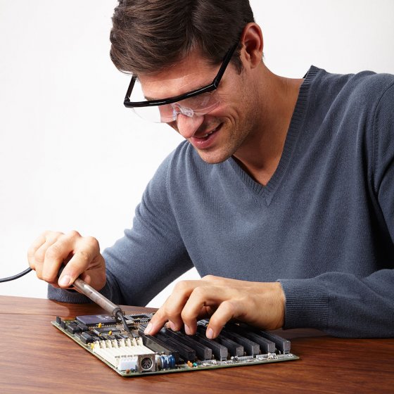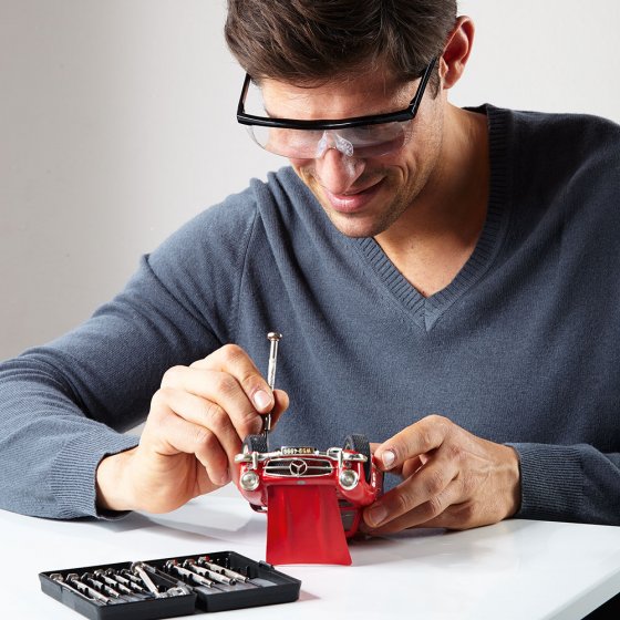 Houdt u van knutselen? Of werkt u regelmatig met kleine onderdelen (bijv. modelbouw of het repareren van kleine mechanische onderdelen)? Dan weet u dat u bij dat werk vaak heel goed moet kunnen kijken. Probleem: Als u met een hand een loep vast moet houden, hebt u nog maar 1 hand vrij om mee te werken. Daarom is het handiger een LOEPBRIL in plaats van een vergrootglas te gebruiken: De bril is superlicht, past zich dankzij de flexibele beugel aan elk hoofd aan en kan zelfs over een gewone bril heen gedragen worden! Vergrotingsfactor: 160%. Materiaal: kunststof. Bekijk het rustig van dichtbij en heb toch beide handen vrij!