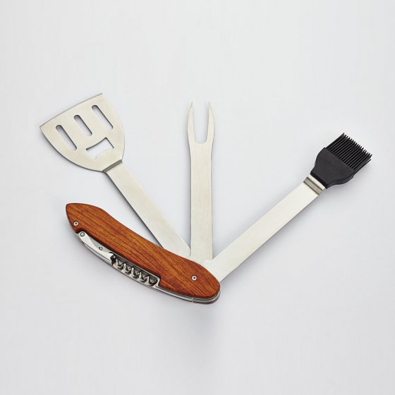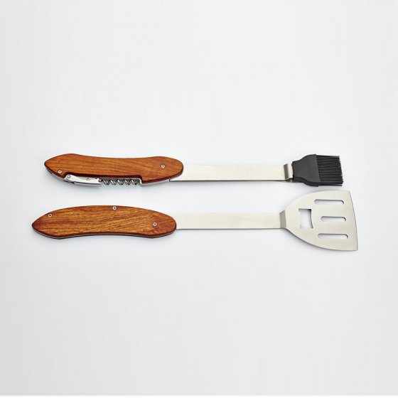 Que serait l’été sans les grillades et le barbecue ? Que ce soit au jardin, sur le balcon ou en pleine nature. Avec LOT BARBECUE “XXL”, vos couverts sont toujours à portée de main, sans devoir fouiller longuement dans vos tiroirs : fourchette à viande, spatule (pour retourner), pinceau à mariner, tire-bouchon et décapsuleur se retrouvent dans un seul et même ustensile multifonctionnel, à l’image d’un couteau suisse. Matière : acier inox (franges de pinceau en silicone), coques en véritable bois de palissandre. Dim. (L x l x H) env. 30 x 9 x 3 cm. Naturellement, ce set convient parfaitement pour faire cuire des steaks et des côtelettes dans votre cuisine !