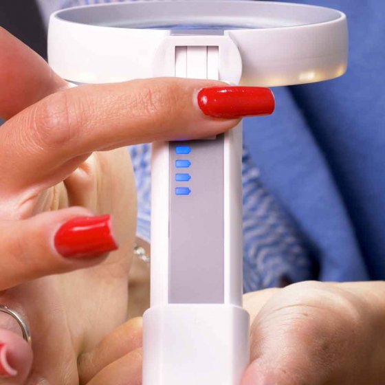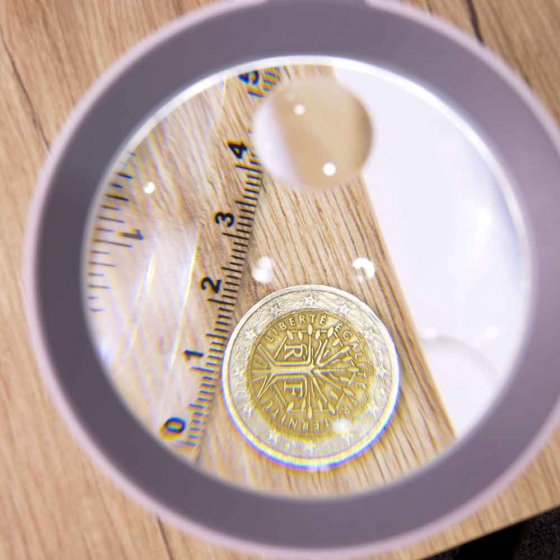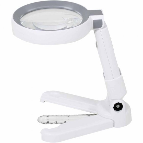 Cette loupe peut faire plus que les autres. Prenez-la dans la main ou posez-la sur la table – pour ce, il suffit de mettre la poignée dans le pied déplié qui intègre, détail pratique, une règle. La lampe de 18 LED blanc est rechargeable (câble inclus) et gradable en 3 niveaux. Idéal pour lire, écrire, pour les travaux manuels ou les petites réparations. Avec deux agrandissements en une seule lentille (5x et 11x), vous avez une vue parfaite sur tous les détails. L'inclinaison de la tête est réglable sur 6 positions. Fonctionne sur batterie li-ion, câble fourni. Dimensions (H x l x P) : env. 20 x 9 x 2 cm (loupe). Ø lentille 7,5 cm. Maintenant, vous y voyez toujours clair, avec une loupe à emporter ou à poser.