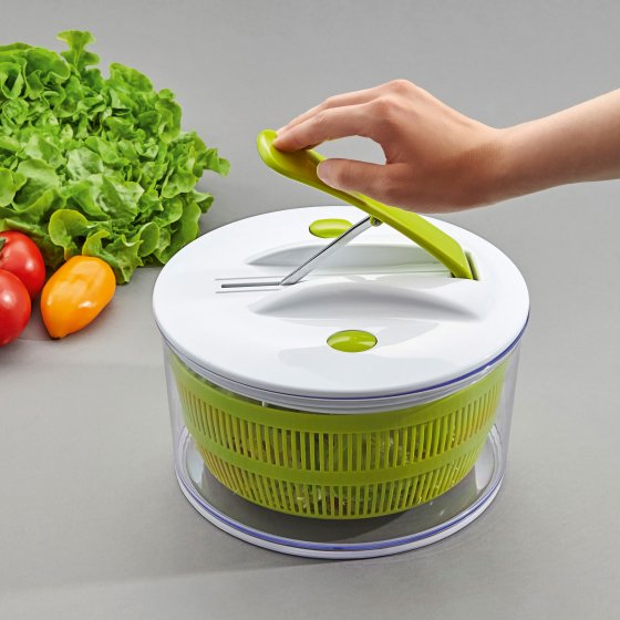 Salade is zo heerlijk gezond: met de 9-delige praktische LUXE-SALADESET zijn rijk gevarieerde rauwkostgerechten in een mum van tijd klaargemaakt! Al het centrifugeren gaat dankzij de hefboomwerking gemakkelijk met de hand: kort drukken is voldoende om het vergiet rond te laten draaien; met de stop-knop kun je hem laten afremmen. Met het extra opzetstuk snijdt, schaaft of raspt u moeiteloos fruit en groente, het snijgoed belandt direct in de kom. Als alles klaar is, plaatst u er de vershouddeksel op en de schalen dienen als reservoir. Afm.: Ø ca. 24 cm, hoogte (met deksel) ca. 17 cm. In een handomdraai maakt u een salade!
