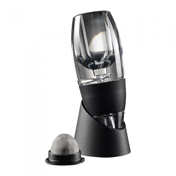 Voor je uit een net geopende fles de wijn kunt drinken, is even tijd nodig: zoals bekend ontplooit het boeket zich pas, als de wijn in contact is geweest met zuurstof. Bovendien moet hij door decanteren worden ontdaan van bezinksels. Deze MAGISCHE WIJNDECANTEERDER doet dat allemaal in een mum van tijd: dankzij een vernuftig luchtkanaalsysteem wordt bij het doorlopen razendsnel zuurstof naar de wijn gevoerd – en de losse zeef houdt wijnsteen tegen. Zo krijgt de wijn glas voor glas de rijpheid om te drinken! Iedere decanteerder is afzonderlijk geïnspecteerd en met de hand gecontroleerd. Afm.: Ø ca. 5 cm, hoogte ca. 14 cm. Geniet van elke wijn direct in perfecte kwaliteit!