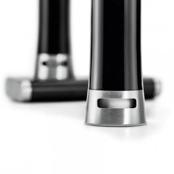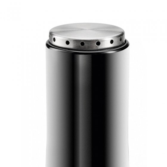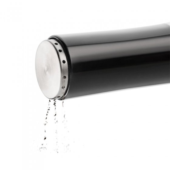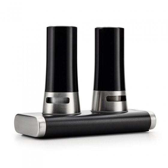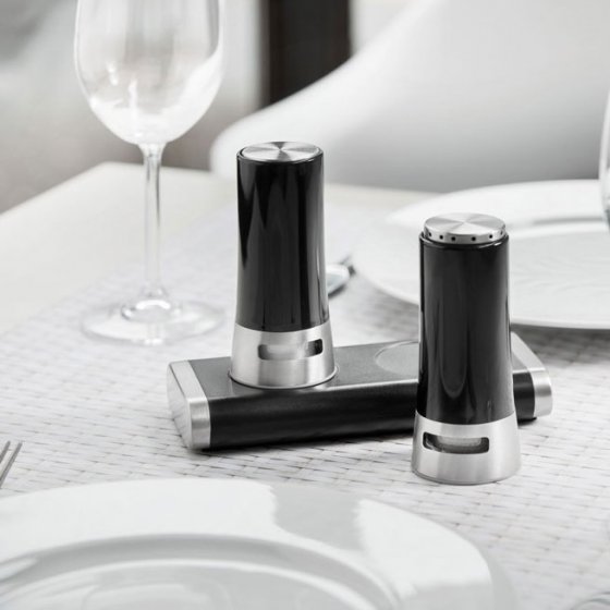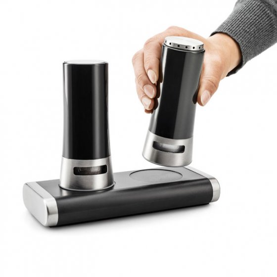 Alleen al wat betreft de look onderscheidt deze MAGISCHE ZOUT- EN PEPERSTROOIER zich van de gebruikelijke uitvoeringen: het design is elegant en de zware sokkel ziet eruit een chique voet. En hij heeft nog iets bijzonders: hij houdt de strooier met magnetische kracht vast, en pas wanneer je hem van de basis haalt, springen de strooiopeningen naar buiten! Per ongeluk omstoten is bijna niet mogelijk, waardoor u niet morst. Materialen: ABS-kunststof en roestvrij edelstaal. Afm. (gemonteerde set, lxbxh): ca. 8x16x14 cm. Zo wordt peperen en zouten een echte belevenis.