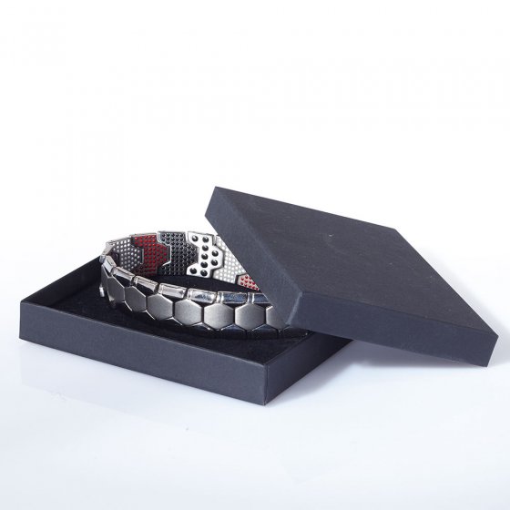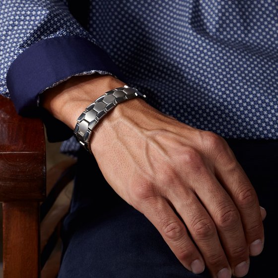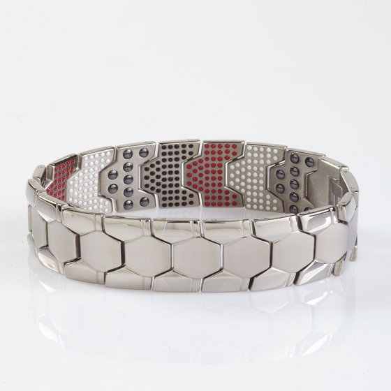 Deze expressieve MAGNETISCHE ARMBAND TITANIUM voor heren valt niet alleen op door zijn mannelijke design en zijn aangename draagcomfort, ook zijn innerlijke eigenschappen zijn onmiskenbaar: met van buitenaf verborgen magneten en energiecomponenten in wit (negatieve ionen), rood ( infraroodgeneratoren) en zwart (edel germanium). Schakels gemaakt van huidvriendelijk en hypoallergeen titanium. Afmetingen (l x b): ca. 22,5 x 1,8 cm. Geleverd in een geweldige geschenkverpakking. Een prachtige armband en ook nog eens een schitterend cadeau voor echte mannen. Niet geschikt voor zwangere vrouwen of mensen met pacemakers.