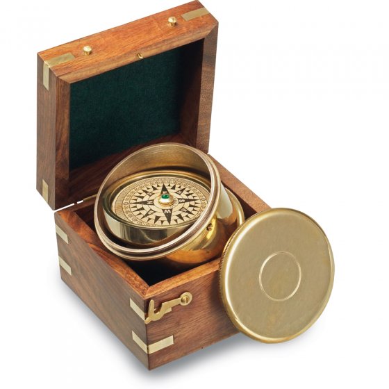 Iedereen die de grote vaart op gaat, hoeft niet per se een baard te hebben, maar wel dit MARITIEME SCHEEPSKOMPAS! Elk exemplaar van deze cilindrische wegwijzer met schroefdeksel is met de hand gemaakt en is uniek! Door de axiale ophanging nivelleert het kompas elke beweging, net als het origineel op volle zee. De klassieke, gestileerde kompasroos is edelsteengelagerd en wijst met de octaaf-aanduiding altijd de juiste weg. Geheel in stijl wordt het apparaat geleverd in een met messing belagen houten kistje. Afm. kompas: Ø ca. 8 cm, hoogte 5 cm. Afm. kistje (dxbxh): ca. 11x11x8 cm. Gewicht incl. kistje: ca. 650 g. Dit sieraad schenkt zowel 'waterraten' als 'landrotten' veel plezier!