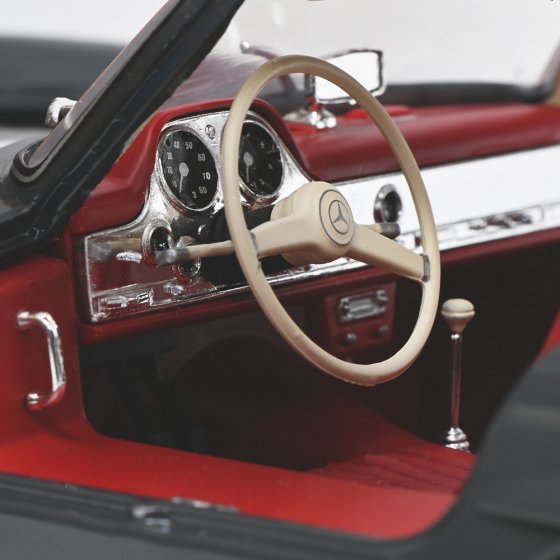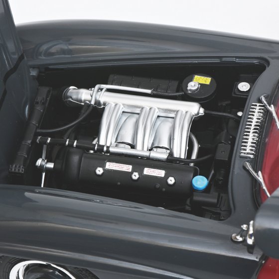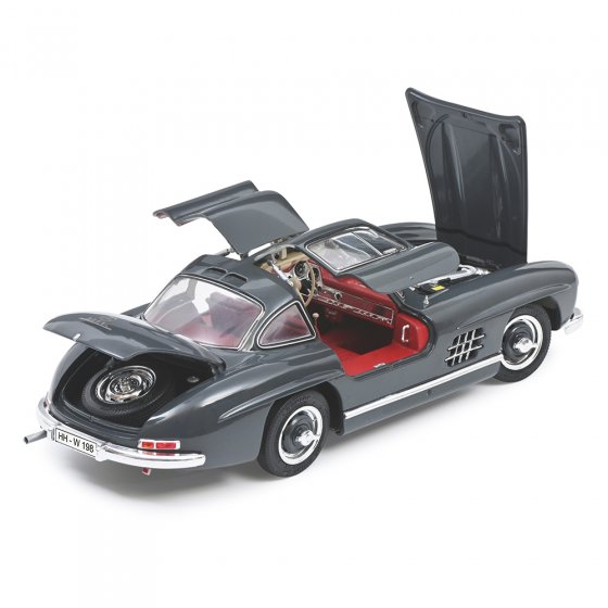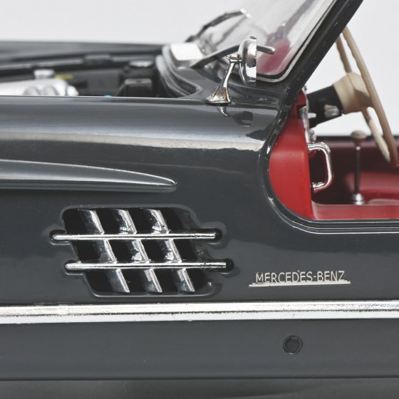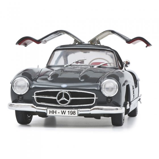 Quand on parle des voitures allemandes à prix exorbitant, la MERCEDES BENZ 300 SL À PORTES PAPILLON vient tout de suite à l'esprit. Lancée sur le marché en 1954, elle s'est rapidement établie comme voiture de sport préférée de la jetset internationale grâce à son époustouflante vitesse de pointe de plus de 250 km/h. Aujourd'hui encore, elle reste une automobile de millionnaire – les exemplaires restaurés se vendent pour un prix à sept chiffres. Procurez-vous ce joyau automobile à l'échelle 1:18 ! Les portes à papillon classiques s'ouvrent, de même que le capot et le coffre. La direction est entièrement fonctionnelle. Dimensions (L x l x H) : env. 25 x 10 x 3 cm. Attention : l'édition est limitée et ce modèle est presque aussi rare que l'original.