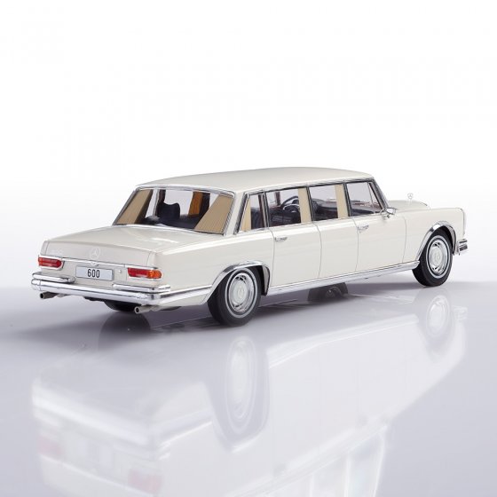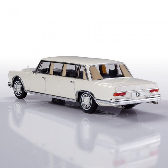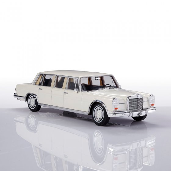 Tussen 1964 en 1981 was er geen sedan ter wereld die representatiever was dan de MERCEDES BENZ 600 PULLMAN (type W 100). Zijn motor van 6,3 liter en 250 pk was groter dan de grootste Rolls-Royce-motor destijds, en zijn carrosserielengte van 6,24 m was ontzagwekkend. Geen wonder dat deze 'grote Mercedes' het favoriete voertuig werd van popsterren en staatshoofden. Dit model op schaal 1:18 is niet minder indrukwekkend dan het origineel: door de vele glimmende chromen applicaties lijkt het wel op een oversized sieraad in uw vitrine. Afmetingen (l x b x h): ca. 31 x 11 x 8 cm. Er waren slechts 487 stuks van het origineel en ze zijn nu allemaal stevig in handen van verzamelaars: het zal waarschijnlijk hetzelfde zijn voor dit schaalmodel.