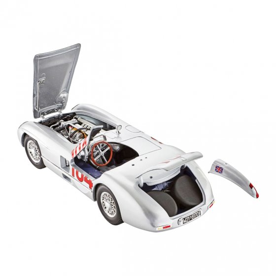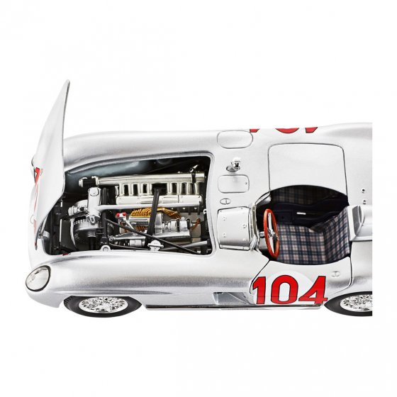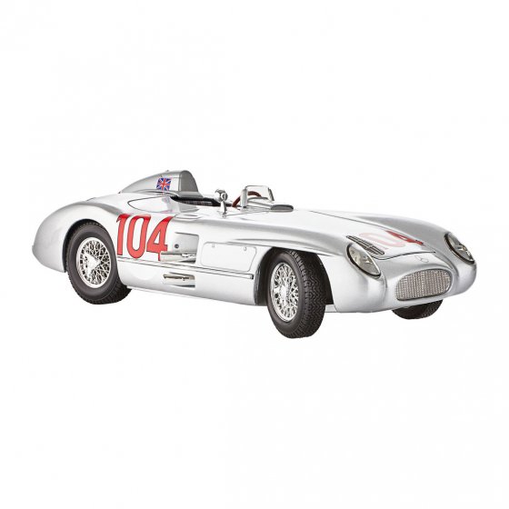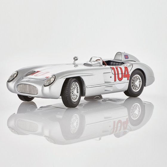 La variante de course de la fameuse Mercedes 300 SL à portes papillon était un coupé deux places ouvert : le SLR 300. En dépit de sa puissance de plus de 260 CV, son moteur de huit cylindres était plus petit que les moteurs Ferrari et Jaguar avec une cylindrée de 3 l. Cela n'a pas empêché Mercedes de gagner avec cette voiture en 1955 le championnat du monde des voitures de sport dans la dernière course grâce à l'équipe géniale de pilotes Stirling Moss et Peter Collins ! Le véhicule vainqueur, la MERCEDES BENZ SLR 300 "TARGA FLORIO", est désormais disponible en modèle miniature 1:18 avec le numéro de départ d'origine (104). Le capot, le hayon et les portières s'ouvrent, les roues avant tournent. Longueur : env. 29 cm. Procurez-vous ce modèle classique avec lequel Mercedes a marqué l'histoire du sport automobile !