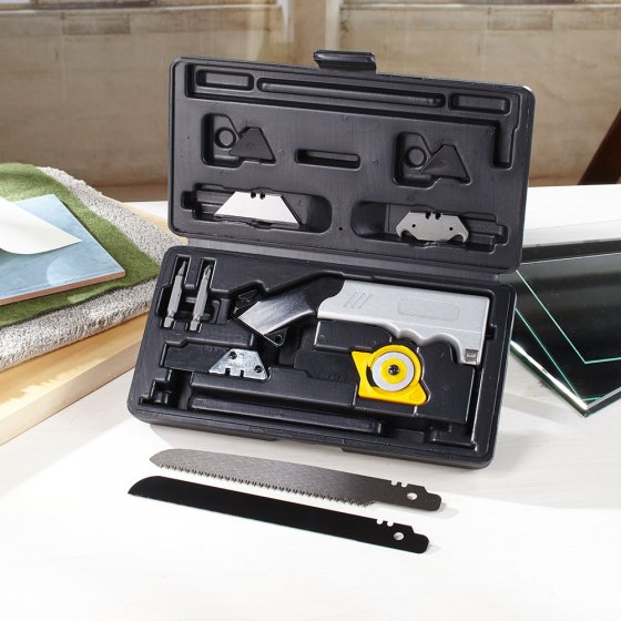 Glas en keramiek bijsnijden, tapijt snijden, hout zagen, schroeven vastdraaien: dat allemaal gaat heel eenvoudig met deze MES- EN SNIJSET. De verwisselbare mesjes snijden door elk materiaal, zelf metaal en taai leer. Tegels snijden? Heel gemakkelijk. Door de meegeleverde bits te bevestigen is het mes indien nodig ook te gebruiken als schroevendraaier. En dankzij zijn stabiele handvat kan hij zelfs als hamer gebruikt worden. Omdat alles in een compacte opbergbox is opgeborgen, is de set perfect mee te nemen. Alle accessoires hebt u altijd bij de hand. Afmetingen opbergbox (l x b x h): ca. 24 x 14 x 5 cm. Met deze gereedschapsset kunt u alles perfect snijden.