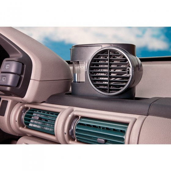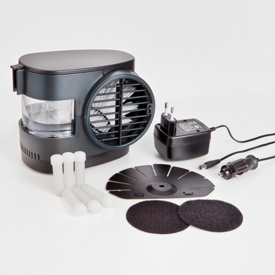 Deze MINI-AIRCOSYSTEEM zorgt zelfs bij extreme hitte voor verkoeling! In de tuin, op yw terras, op vakantie, in de slaapkamer - of in de auto! - Het mobiele apparaat wordt overal gebruikt. Vul gewoon de tank (ongeveer 0,45 l), aanzetten - en gelijk zorgt de ventilator voor een aangename koeling. De ventilator heeft 2 snelheden en verstelbare ventilatieopeningen - u bepaalt hoe warm het wordt. De 6 meegeleverde invriesbare koelelementen met water kunt u ook in de watertank leggen - voor een nog intenser verkoelend effect! Afm.: ca. 16 x 14 x 13 cm. Werkt met de meegeleverde 230V-netstekker of 12V-autoadapter. Probeer het uit!