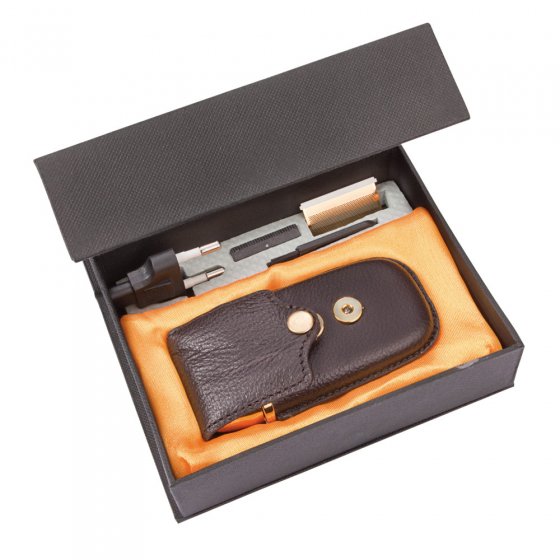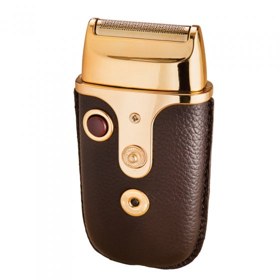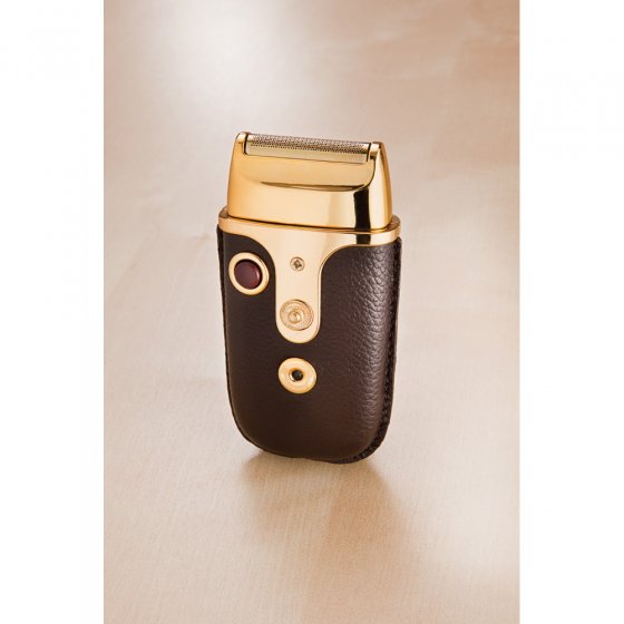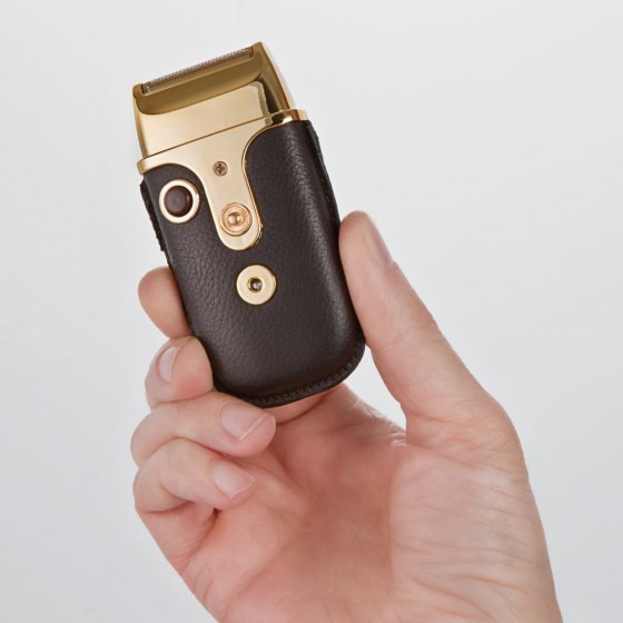 Son élégance, son boîtier doré et sa coque de protection en fleur de cuir marron foncé donnent à ce MINI-RASOIR RECHARGEABLE un côté chic au style rétro. Sa grille de rasage flexible de grande qualité permet un rasage de très près, avec le confort du sans fil. Avec sa fiche-secteur rabattable vous le branchez directement sur une prise. Après rechargement complet il offre une autonomie de 30 minutes : bien plus de temps qu'il ne faut pour un rasage soigné ! Avec ses petites dimensions env. 11 x 6 x 2 cm il tient parfaitement dans la main. En voyage il se glissera facilement dans votre nécessaire de toilette. Tête intégrée pour les pattes. Livré dans un coffret cadeau avec lames de rechange et brosse de nettoyage. Un modèle très chic et très fonctionnel adapté à un usage quotidien ou en vacances : le cadeau idéal !