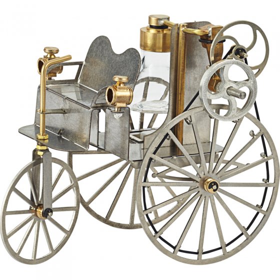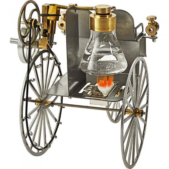 Het industriële tijdperk werd in essentie door twee baanbrekende uitvindingen gekenmerkt: door de stoommachine en de verbrandingsmotor. Bij de meesterlijk met de hand vervaardigde MINI-STOOMDRIEWIELER zijn beide innovaties op fascinerende manier verwerkt: de driewieler functioneert volgens het stoommachineprincipe, d.w.z. het zet warmte om in bewegingsenergie. Zijn design is echter aan het design van de gepatenteerde motorwagen 1 van Carl Benz, dus het eerste voertuig met verbrandingsmotor, aangepast. Materiaal: metaal. Werkt op droge brandstof (meegeleverd). Afm. (lxbxh): ca. 11 x 7x 9 cm. Ontdek het stoommachineprincipe met dit rijdende object!