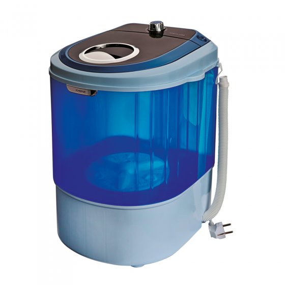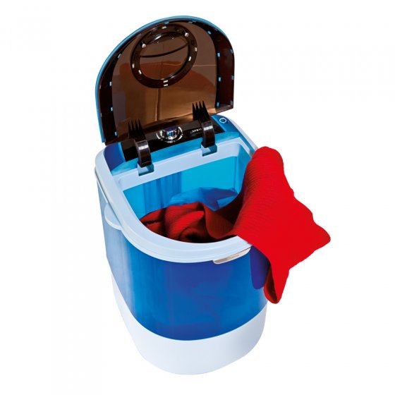 U wilt besparen, waar het kan? Dan is de MINI WASMACHINE precies goed voor u! Speciaal voor eenpersoonshuishoudens, is het zeer handig. Tot 2,5 kg wasgoed per wasbeurt - in no time en zonder onnodige verspilling van geld. In plaats van “de grote was” te draaien met een half lege trommel bespaart u met de mini wasmachine elektriciteitskosten en water – Uw huishoudbudget zal u dankbaar zijn! Zelfs delicate items die u anders apart wast met de hand worden schoon in een mum van tijd – zonder de kosten en veel grondiger dan een handwas! Afmetingen 50 cm x 37 x 36 cm. Vermogen: 160 watt, capaciteit 2,5 kg droge was. Een echte ruimtebesparende oplossing – ideaal voor vakanties en kamperen!