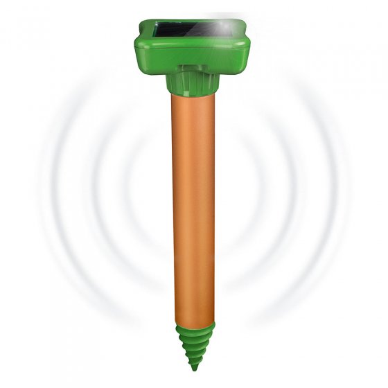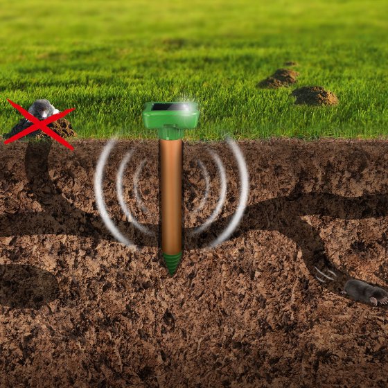 Bij het verdrijven van mollen brengen vibratieapparaten vaak uitkomst – maar in harde bodems is het normaal gesproken lastig om ze aan te brengen. Met deze MOLLEN-MIERENVERJAGER DELUXE OP ZONNE-ENERGIE is dat een heel ander verhaal: dankzij de boorschroefdraad aan de punt steekt u de grondpen gemakkelijk in elk soort bodem. Omdat het apparaat niet alleen met vibraties werkt, maar ook met geluid, is het extra effectief: het werkt op een oppervlak van ca. 1.250 m2. Boven de grond zijn de geluiden overigens nauwelijks waarneembaar. Werkt op 3 mignon-batterijen (incl.) en zonnepaneel. Afmetingen (l x b x d): ca. 34 x 10 x 10 cm. Activiteitsinterval: 2 sec. on / 50 sec. off. Maak uw tuin tot een mol- en miervrije zone.