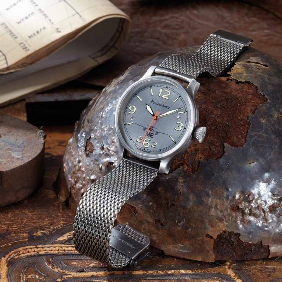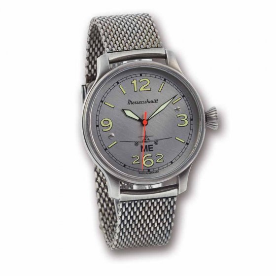„ME 262“ est un des sigles les plus connus de l'histoire aéronautique, car il s'agit de la dénomination de type du premier avion à réaction de série – construit entre 1943 et 1945 par l'entreprise allemande Messerschmitt AG. La MONTRE AUTOMATIQUE ME262 EXTREMA évoque ce jalon de la technique : son cadran est fait à partir d'un morceau de tôle original de l'avion ME262 ! Aussi bien le boîtier en acier inoxydable que le bracelet ont été brunis avec soin pour harmoniser leur apparence avec la tôle patinée de l'avion. Le mouvement horloger est un mouvement automatique suisse. Dimensions : Ø env. 42 mm, épaisseur du boîtier env. 12 mm. Trotteuse orange. Pour les fans de montres d'aviateur classiques, cette montre est un must !