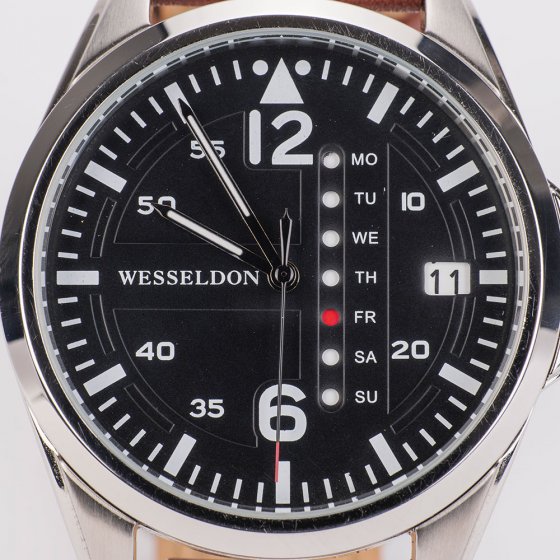 De toutes les catégories de montre, les montres d'aviateur comptent parmi les plus appréciées. Leur popularité vient surtout du fait qu'aux débuts de l'histoire aéronautique, une montre de précision était indispensable à la survie. La MONTRE HOMME "AVIATOR CLASSIC" a tous les éléments de design de cette catégorie très prisée : cadran foncé à chiffres et index clairs, aiguilles en forme de flèche, index 0 triangulaire. De plus, elle a un affichage vertical du jour de la semaine qui rappelle l'altimètre d'un instrument de cockpit. À l'intérieur se trouve un mouvement à quartz Miyota de précision. Dimensions : Ø env. 40 mm, épaisseur du boîtier : env. 10 mm. Étanchéité : 3 ATM. Vous aimez les montres au design classique ? Alors offrez-vous cet exemplaire raffiné !