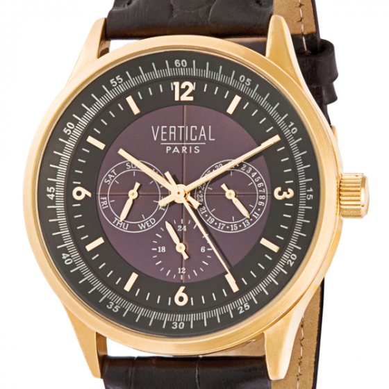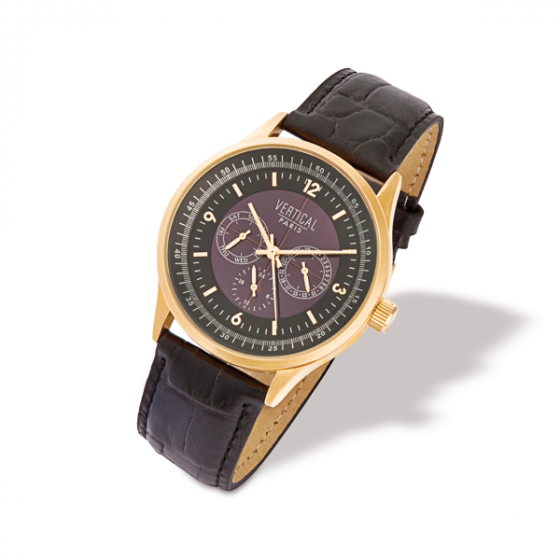 Cette MONTRE HOMME SOLAIRE « VERTICAL » d’une élégante parfaite avec son bracelet cuir, se fera remarquer à votre poignet par son aspect luxe. Mais son aspect extérieur n’est pas seul à l’origine de sa particularité. Elle fonctionne essentiellement grâce à une énergie renouvelable et est l’une des premières à disposer d’un mécanisme à quartz solaire avec 3 aiguilles, la date, les jours de la semaine et un cadran 24h ! Son cadran typé noir intense est en fait une cellule solaire ultra moderne et performante qui transforme la lumière en courant et alimente l’accumulateur intégré. Plus besoin de piles nocives pour l’environnement ! 3 aiguilles lumineuses et lunette couleur or aspect brossé. Résiste à une pression de 5 ATM, verre minéral trempé, fond en acier affiné, bracelet cuir moderne aspect croco. Une montre fiable, d’une beauté classique pour les hommes pour qui l’heure compte !