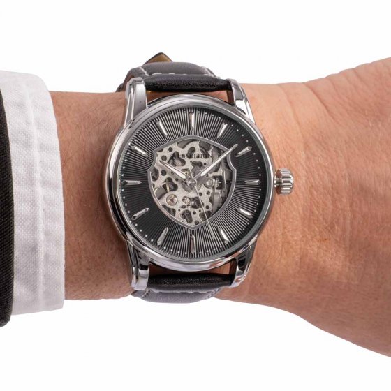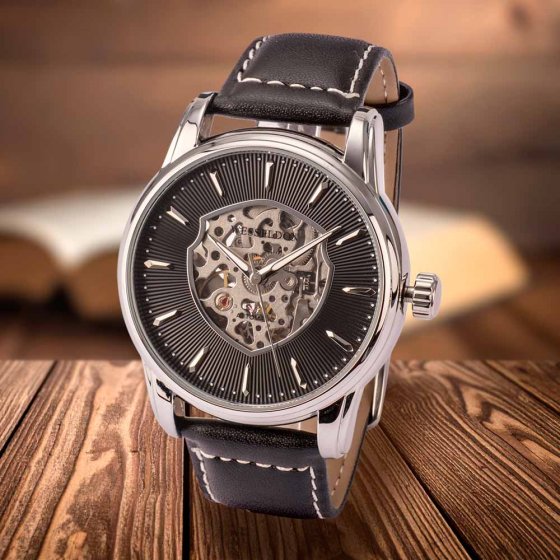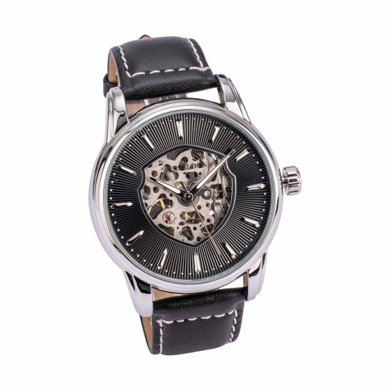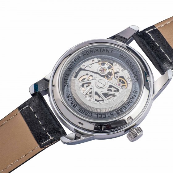 Normalement, les montres qui s’inspirent du sport automobile se distinguent par la diversité de leurs fonctions (chronomètre, minuteur, etc.). La montre homme Wesseldon « Squelette Automatic » par contre, mise sur un look fascinant : son cadran, dont la forme rappelle le logo d’une célèbre marque italienne de voitures de sport, laisse entrevoir le mouvement horloger qui travaille à l’intérieur. Cela invite à laisser le regard s’attarder sur la montre plus de temps qu’il n’en faut pour lire l’heure ! Dimensions du boîtier (Ø) : env. 44 mm. Matière : boîtier et fond en acier inoxydable, glace en verre minéral. Disponible en deux variantes de couleur (bleu et noir). Offrez-vous une montre qui fait effet !