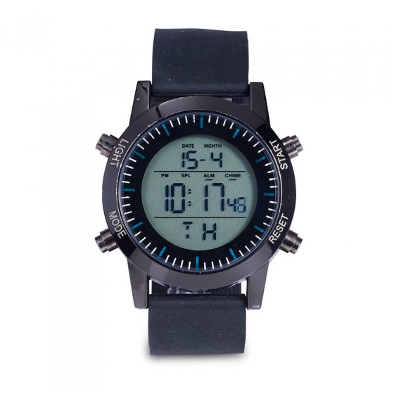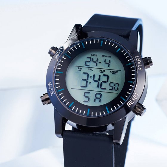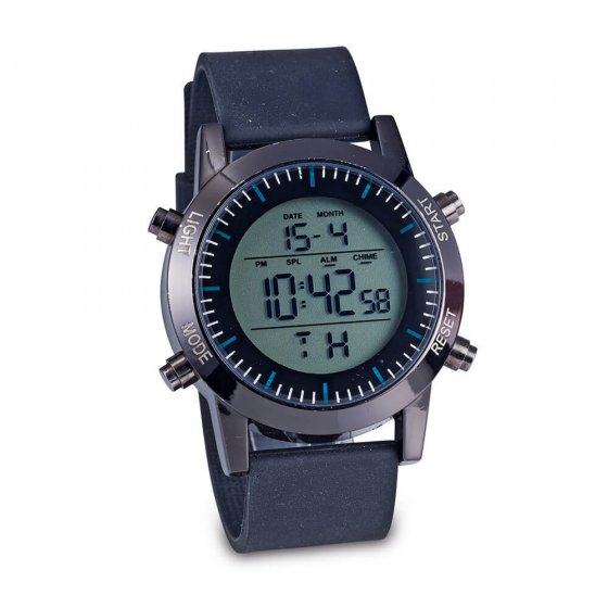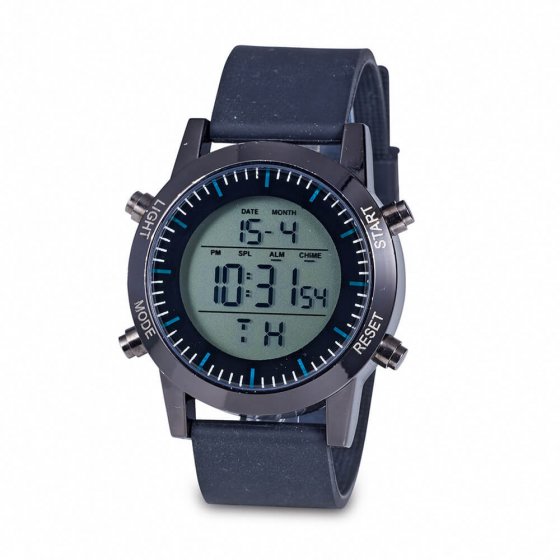 De jour ou de nuit : toutes les fonctions de la MONTRE ÉLECTRONIQUE AVEC CHRONOMÈTRE sont parfaitement affichées sur le grand cadran LC rétroéclairé. Sur pression d’un bouton, le cadran bien lisible s’allume d’une lumière bleue agréable pour les yeux. En plus de l’affichage de l’heure, de la date et du jour de la semaine, la montre polyvalente présente aussi des fonctions supplémentaires pratiques, notamment chronomètre et réveil avec répétition d’alarme ! Poids : env. 70 g. Dim. (Ø x H) : env. 4,3 x 1,3 cm. L’élégant bracelet ultra flexible en silicone est doux sur la peau et s’ajuste parfaitement à tous les poignets !