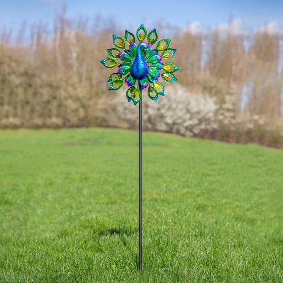 Les voisins ne vont pas en croire leurs yeux, tant ce MOULIN À VENT SOLAIRE À LED PAON est impressionnant. Pendant la journée, il offre un spectacle fascinant des deux côtés dès que le vent met en mouvement ses ailes à l’apparence de plumes de paon peintes à la main dans des coloris magnifiques. Le soir, la lampe solaire en verre craquelé prend la relève grâce au capteur crépusculaire et vous propose le jeu envoûtant de ses lampes LED à couleur changeante. Fixation facile par un piquet de terre à 3 pointes. Dimensions (L x l x Ø) : env. 130 x 18 x 37 cm. Matière : métal. Avec ce superbe moulin décoratif, vous êtes sûr d’attirer les regards curieux de nombreux spectateurs.