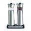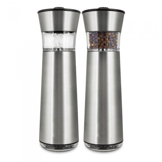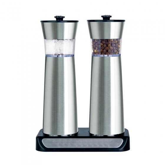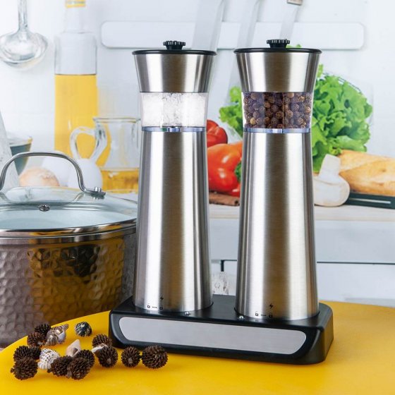 Avec les MOULINS À ÉPICES RECHARGEABLES, l’assaisonnement devient une expérience inoubliable. Il suffit de les retourner et de les tenir au-dessus des plats – les moulins électriques se mettent en marche automatiquement ! Chaque moulin est équipé d’un broyeur en céramique inusable pour moudre cristaux de sel, grains de poivre, clous de girofle ou autres épices. La finesse est réglable en continu. Les moulins fonctionnent sur batterie ; le chargement s’effectue en permanence sur la station de charge (230 V) qui sert aussi de support. Les deux moulins sont ainsi toujours prêts à l’emploi. Le corps est en acier inoxydable brossé avec fenêtre de visualisation. Dimensions de chaque moulin (Ø x H) : env. 6 x 22 cm. Assaisonnez comme un chef !