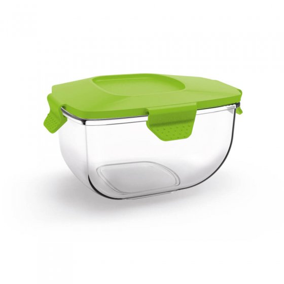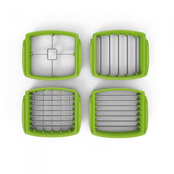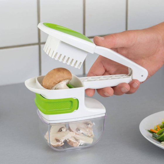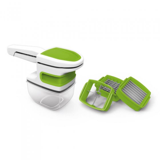 Mes en snijplank zijn niet nodig. Met de MULTI-SNIJDER 'CHOP-GENIE' snijdt u netjes ruit en groente in een mum van tijd, in dikke en dunne plakjes, dobbelsteentjes of kwarten. Snijd direct in de pan, kom of bord, of maak gebruik van de praktische opvangbak (275 ml) met stevig afsluitbare deksel. Uw handen blijven schoon. De 4 mesinzetten van edelstaal zijn snel en veilig te verwisselen. De 7-delige set van gemakkelijk te onderhouden kunststof is compact en gemakkelijk op te bergen. Afmetingen (l x b x h): ca. 20 x 13 x 8 cm. Geniet van heerlijke salades en eenpansgerechten, wanneer u dat wilt.