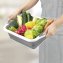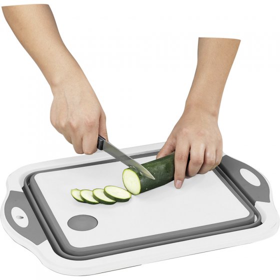 Zo bereidt u eten op efficiënte wijze: snij eerst alle ingrediënten (vlees, vis, groenten) op een snijplank en vouw vervolgens de randen van de plank omhoog. De gesneden etenswaren zitten vervolgens meteen in een bak die u makkelijk kunt meenemen! Klinkt geweldig, toch? Nou, dat is het ook. 'MULTIFUNCTIONELE MAND EN SNIJPLANK', dat is het idee. En dat is nog niet alles: aan de onderkant zit een waterafvoer die open kan, zodat u ook groente kunt wassen, de vaat kunt doen en ook de was kunt doen in de bak. Afmetingen (l x b x d): ca. 43 x 31 x 3–16 cm. Materiaal: PP en TPE. In de camper, het vakantiehuis of uw eigen keuken – dit keukengerei bespaart overal ruimte en moeite!