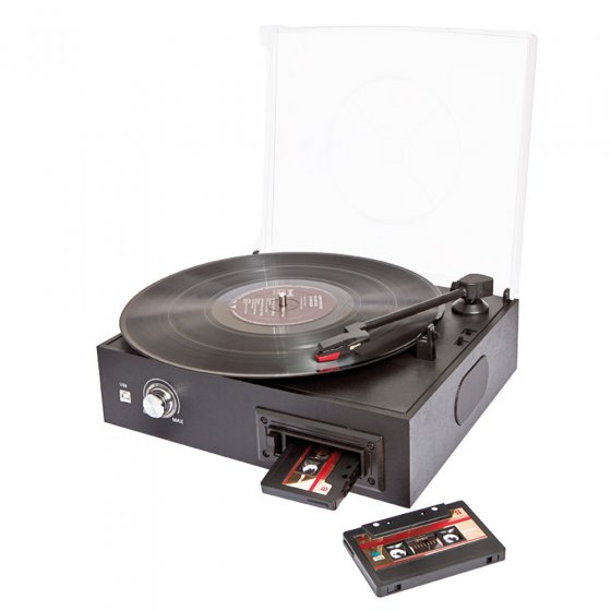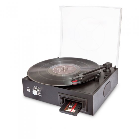 2 luidsprekers, beschermkap en geïntegreerd cassettedeck. Functioneert met 230 V. Buitenkant van gefineerd hout. Afmeting ca. 37 x 33 x 21 cm. Met deze multimedia pick-up is het omschakelen van uw muziekverzameling
