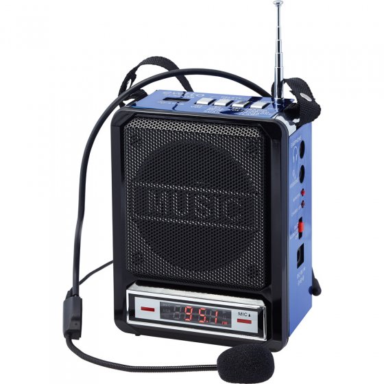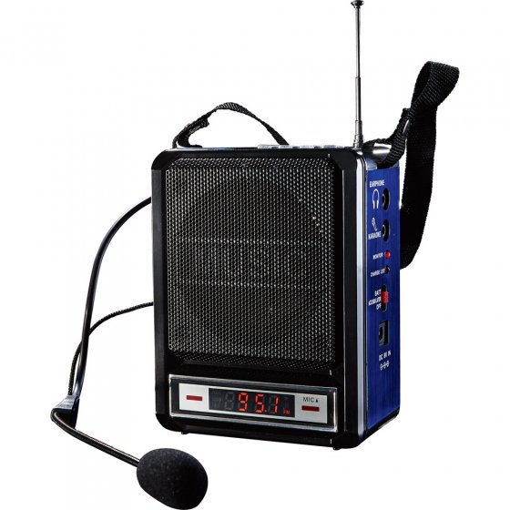 Caractéristiques techniques : • Chargement de la batterie grâce au câble 220–240V • Prise pour écouteurs • Sortie AUX pour brancher un micro externe • Emplacement pour carte SD • Emplacement pour clé USB • Formats audio : MP3/WMA/WAV