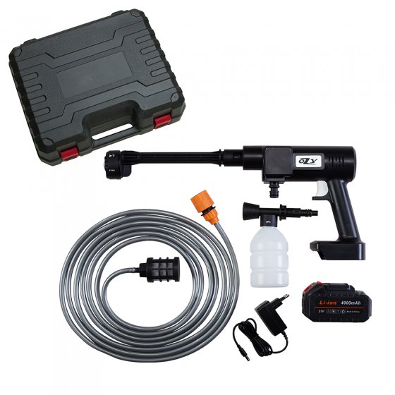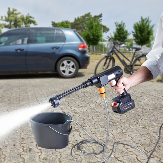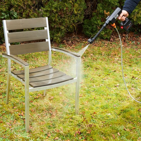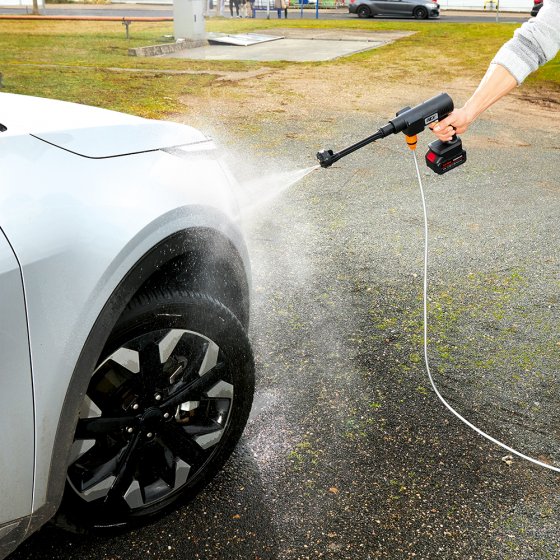 Éliminer le pollen de la carrosserie, nettoyer le vélo, laver les meubles de jardin : le NETTOYEUR PUISSANT SANS FIL « JET » convient parfaitement pour tous ces travaux. Pas besoin de prise de courant ni de robinet pour cela; il suffit d’un grand seau d’eau ou d’une autre source d’eau (citerne, rivière, mare, etc.). Plonger le tuyau dans l’eau, mettre en marche – et c’est parti ! Avec un vaste choix d’accessoires (réservoir à savon, tuyau, filtre, etc.), le nettoyeur puissant sans fil est aussi polyvalent qu’un appareil de professionnel. Avec 6 réglages de jet d’eau. Dimensions (L x l) : env. 44 x 22 cm. Longueur de tuyau : 5 m. Idéal pour les propriétaires de bateau ou les amateurs de camping en caravane ou camping-car !