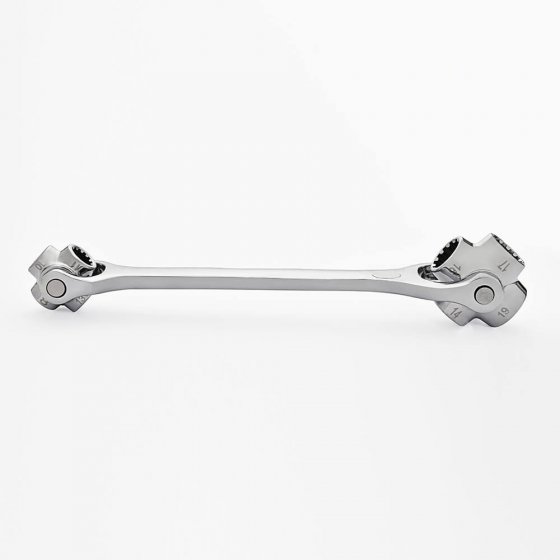 Voor onderhoudswerkzaamheden aan de fiets en de auto of voor de bouw van meubelen heeft u nu altijd de juiste sleutel bij de hand! Deze solide 8-in-1 STEEKSLEUTEL gemaakt van hoogwaardig corrosie- en oxidatieresistent chroomvanadiumstaal heeft 2 roterende koppen met 4 moeren van verschillende grootten. Met behulp van een in elkaar sluitend systeem kunnen de verwisselbare koppen worden vergrendeld, en u kunt de sleutel horizontaal of verticaal gebruiken. Met een diameter van 8, 10, 11, 13, 14, 16, 17, 19 mm vervangt dit hulpmiddel verschillende individuele sleutels. Met magneet voor ophanging op metalen strips. Lengte: ca. 25 cm. Onmisbaar voor doe-het-zelvers en klussers!