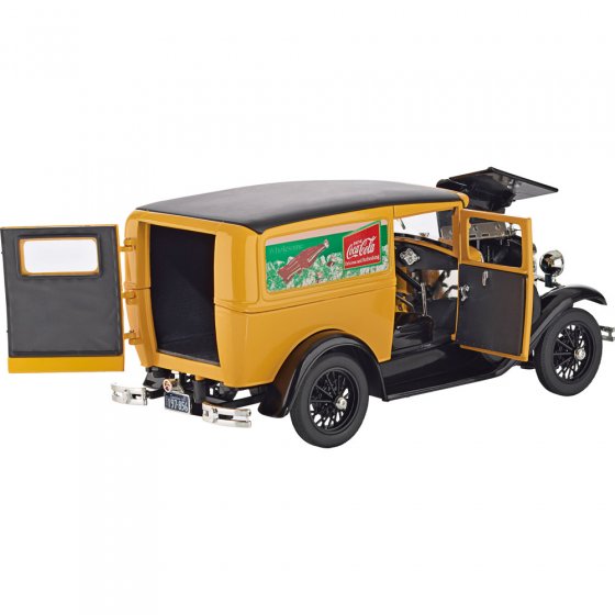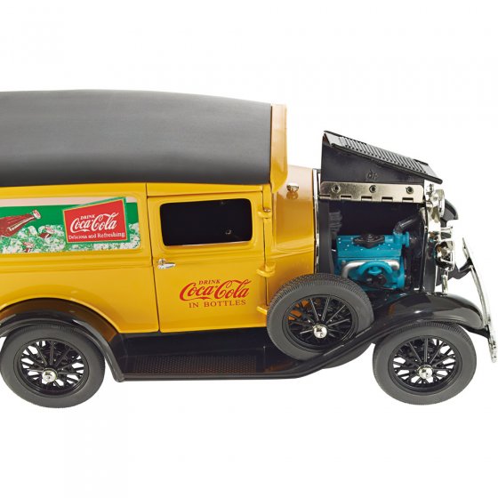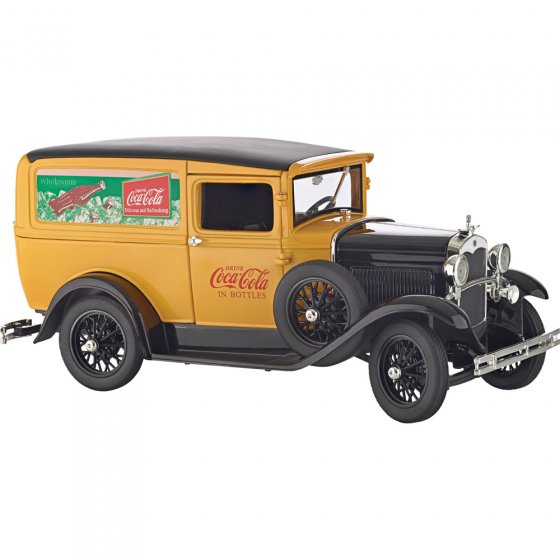 Ford bereikte met Model T, de ‘Tin Lizzy’, een miljoenenpubliek ? en verwaarloosde vervolgens de ontwikkeling van nieuwe modellen. Aan het eind van de jaren ’20 was het de hoogste tijd voor een opvolger: Fords Model A werd in alle haast ontwikkeld en was dan ook geen technische mijlpaal. Maar hij blonk wel uit door zijn onvergelijkbare robuustheid en eenvoud. Gevolg: Ford heroverde met dit model het marktleiderschap. Zelfs vandaag de dag zijn er nog meer dan een half miljoen rijdbare Ford A-voertuigen! Het model FORD A-BESTELAUTO COCA COLA van 1931 is gemaakt van gegoten zink en voorzien van onderdelen van kunststof. De vooras is draaibaar en de portieren kunnen open; ook de kofferdeksel en de vouwbare motorkap kunnen worden geopend. In de motorruimte is de legendarische 4-cilindermotor met 40 pk te zien. Afmetingen (l x b x h): ca. 23 x 10 x 10 cm. Maak uw verzameling volledig met deze tweede nummer 1 van Ford!